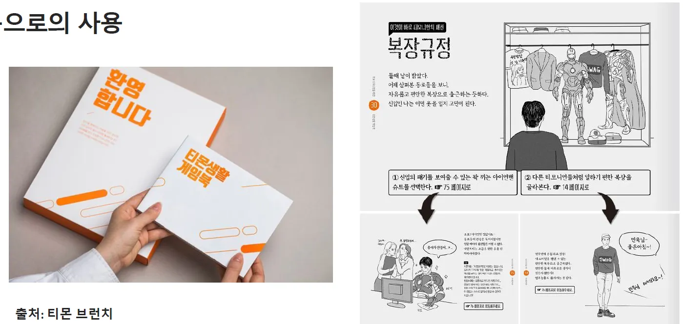 이렇게 ‘컬처북’ 형태로 만들어놓으면 활용 범위가 높다. ‘채용’을 할 때도 해당 기업이 추구하는 가치와 문화, 규칙을 보여주어 마음에 기업에 맞는 사람을 채용하기 용이해진다. 내부적으로는 기업의 가치를 공유하고, 입사자 교육용으로도 활용할 수 있다. 아예 컬처북 자체를 ‘상품’으로 내놓는 기업도 해외에는 존재한다(HubSpot).