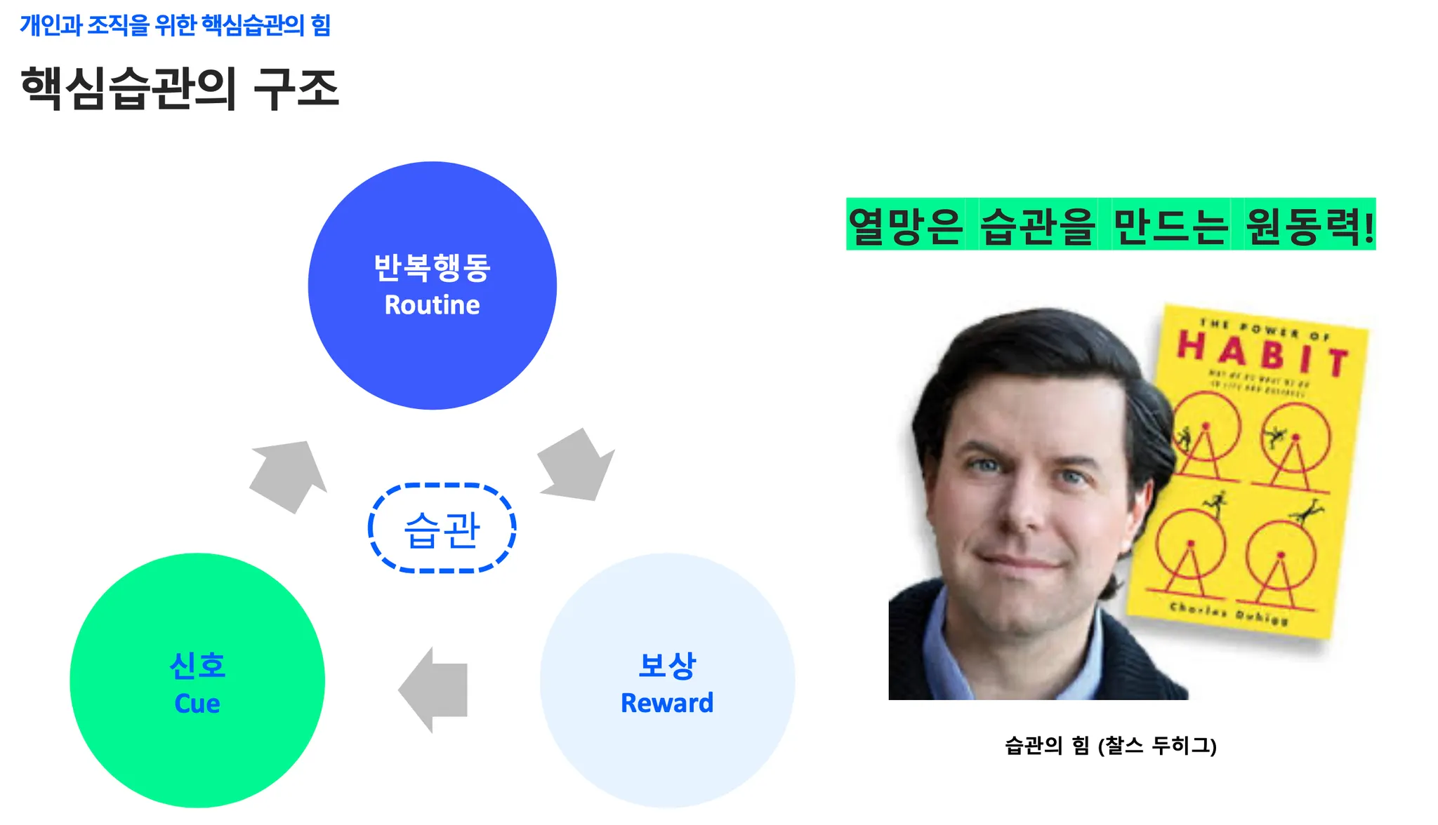 모든 습관은 ‘큐 사인’을 통한 반복 행동과 보상으로 이어진다. 이것이 ‘조직’ 차원에서 이루어져야 한다. 조직 차원에서 이루어지려면, 사람이 아니라 ‘환경’을 먼저 바꾸고자 해야 한다.