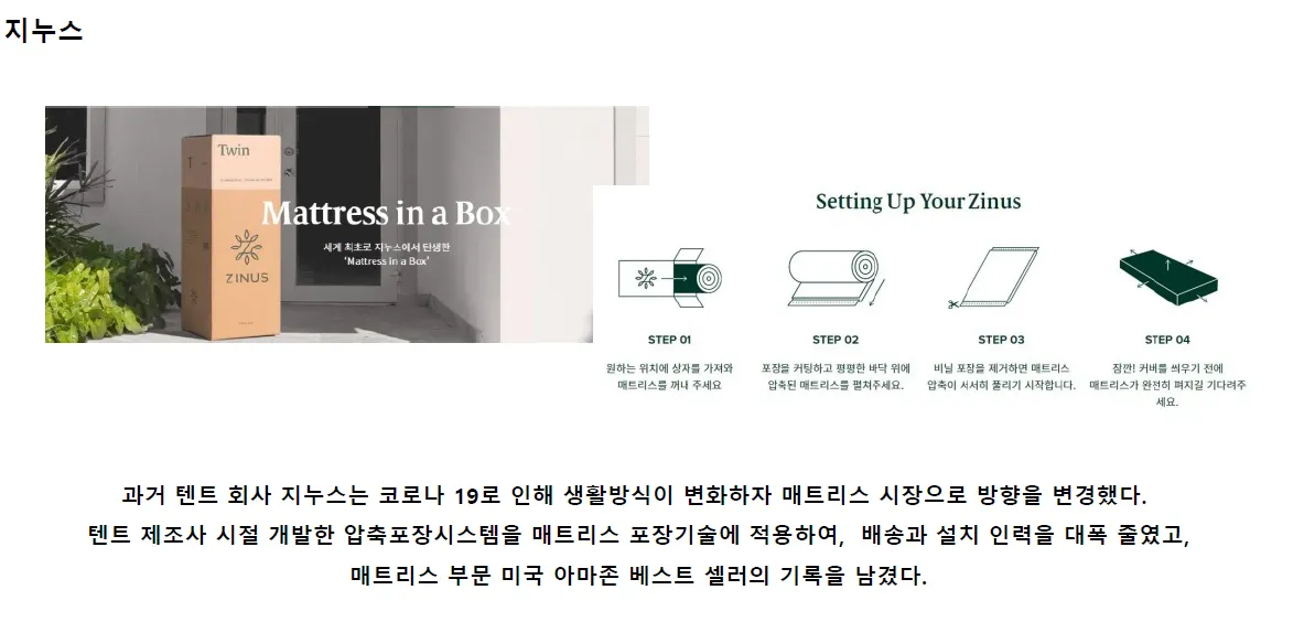 심지어 회사 중 ‘텐트 회사’에서 ‘매트리스 회사’로 전향한 경우도 있다. 그런데 그 회사가 가지고 있는 핵심 기술은 더 기가 막히다. 바로 ‘압축 포장 시스템’이다. 코로나 상황에서, 기업이 가지고 있는 압축 포장 기술을 매트리스 포장에 적용하였다. 이를 통해 많은 부분의 비용을 절감하면서 매트리스 회사로 완전히 전향을 한다.