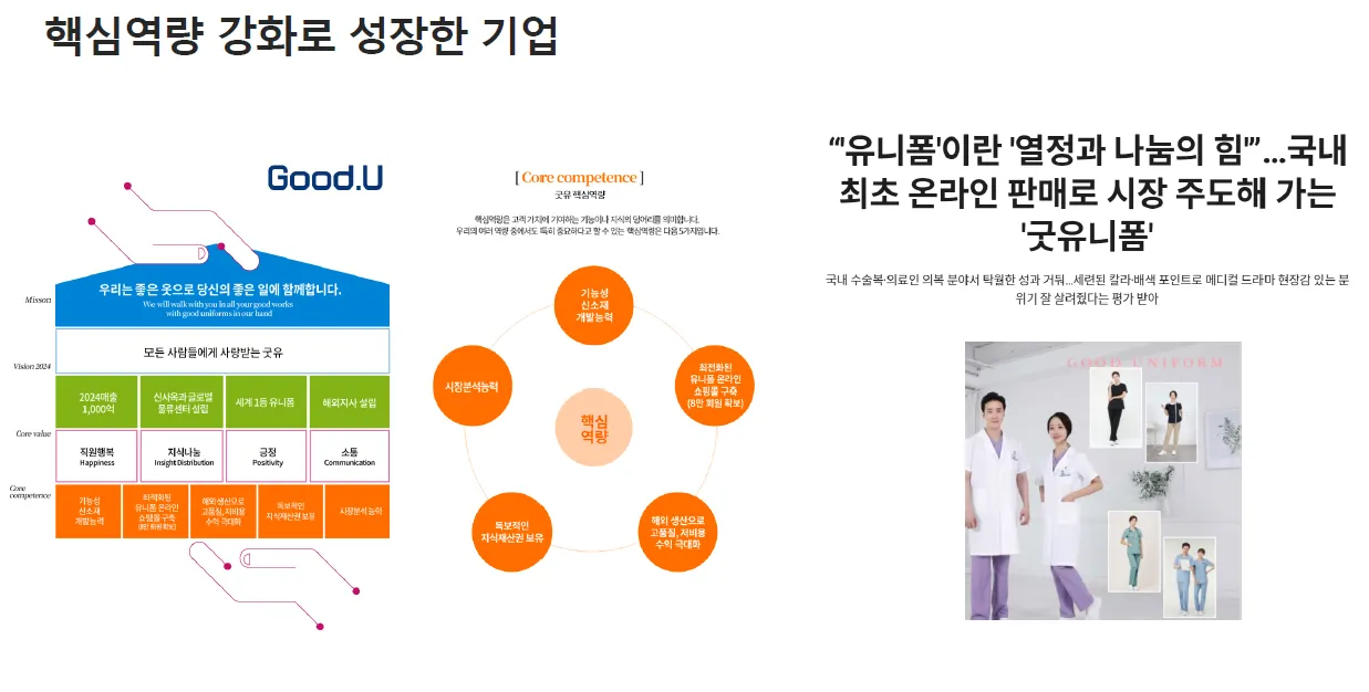 실예로 Good.U라는 기업을 이야기해보겠다. 해당 기업은 ‘유니폼’ 계열에서 가장 큰 점유율을 보유하고 있는 기업이다. 그런데 이 기업이 성장할 때 집중한 시장이 있다. 바로 ‘병원 유니폼’ 시장이다. 해당 기업은 초창기부터 ‘병원 유니폼’에 자신감을 가지고 있었다고 한다. 그 상황에서 기업은 ‘병원 유니폼’에 대한 역량을 강화하여 해당 시장의 승자가 되고자 하였다. 유니폼 개선을 위해 직접 병원에 찾아가 유니폼을 입는 사람들에게 착용감이나 불편한 점, 개선점 등을 직접 ‘물어보면서’ 개선을 했다. 지금의 Good.U가 있기 까지는 ‘병원 유니폼’에 대한 역량 강화가 뒤따랐다.