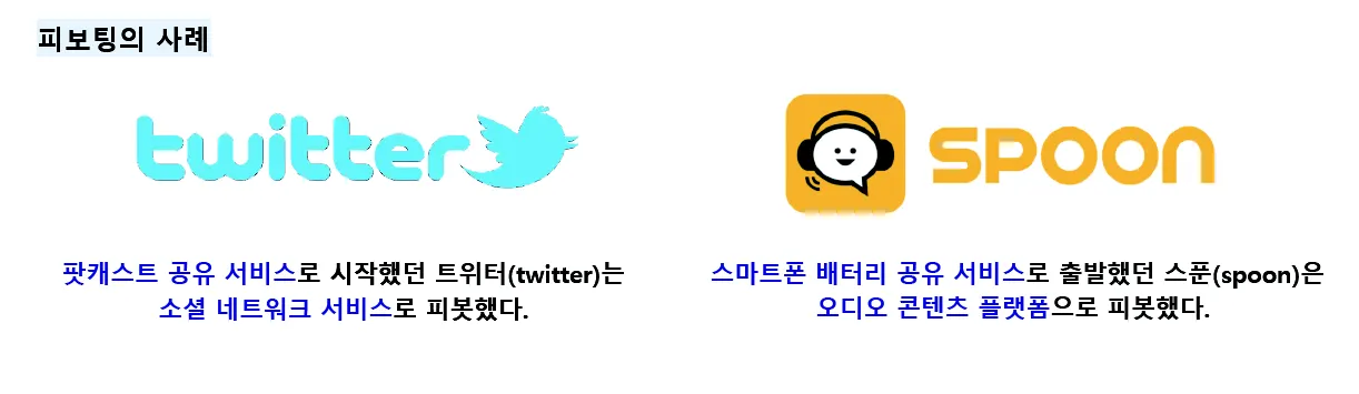 이와 함께 이야기해볼 수 있는 것이 ‘피봇팅 전략’과 ‘플라이 휠’ 전략이다. 피봇팅은 기업의 사업 방향을 기존 역량과 아이템을 토대로 다른 쪽으로 전환하는 것을 말한다. 실제로 우리가 아는 많은 기업들이 이렇게 ‘피봇팅’을 통하여 성장해왔다. 트위터의 출발은 ‘팟캐스트 공유 서비스’이다. 오디오 콘텐츠 플랫폼인 ‘스푼’은 본래 스마트폰 배터리 공유 서비스로 출발하였다.