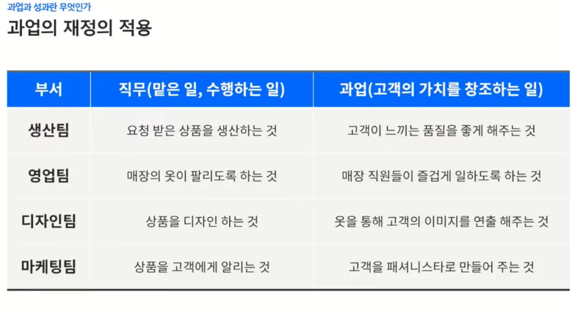 직무는 단순히 각자가 맡은 일이 아니다. 여기에는 사명이 포함이 되어야 한다. 기업과 부서의 사명은 무엇으로 나와야 할까? 당연히 ‘고객’으로부터 와야 한다. 단순히 맡은 일이 아닌, ‘고객의 가치를 창조하는 일’로 다시 정의를 해야 한다. 피터 드러커의 생각 처럼, 기업이 사명과 부서의 과업은 모두 고객을 중심으로 이루어져야 한다.