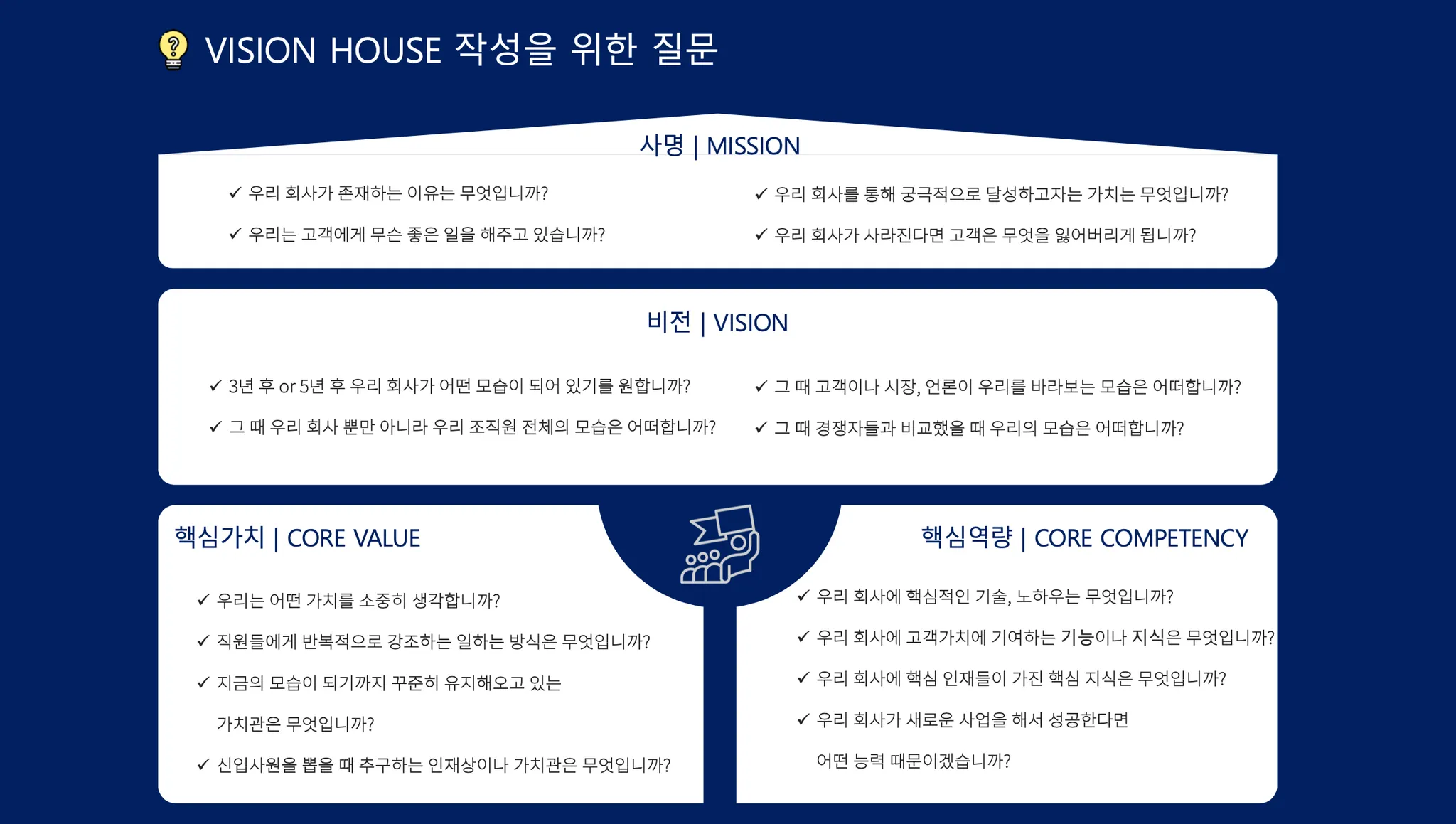 기업들의 ‘한 문장’ 안에는 기업이 중요하게 여기는 것(Core Value), 기업이 가지고 있는 주요 역량(Core Competency), 사명(Mission)과 비전(Vision)이 모두 담겨있다. 모두 담겨있다는 것은 이것들을 ‘전제’하여 작성한다는 것이다. 이 모든 것을 한 장의 이미지에 담는 것이 바로 ‘비전 하우스’ 이다.