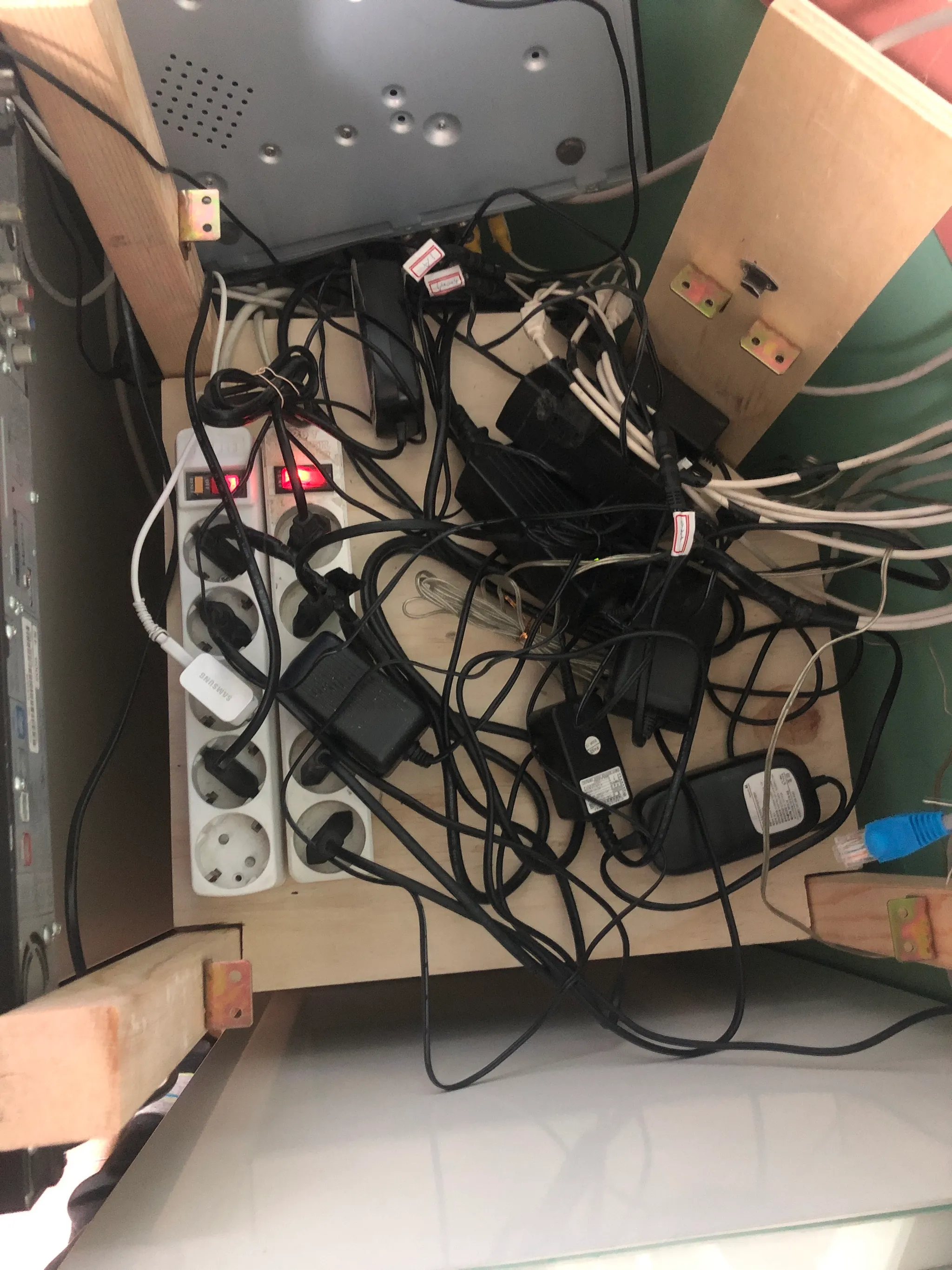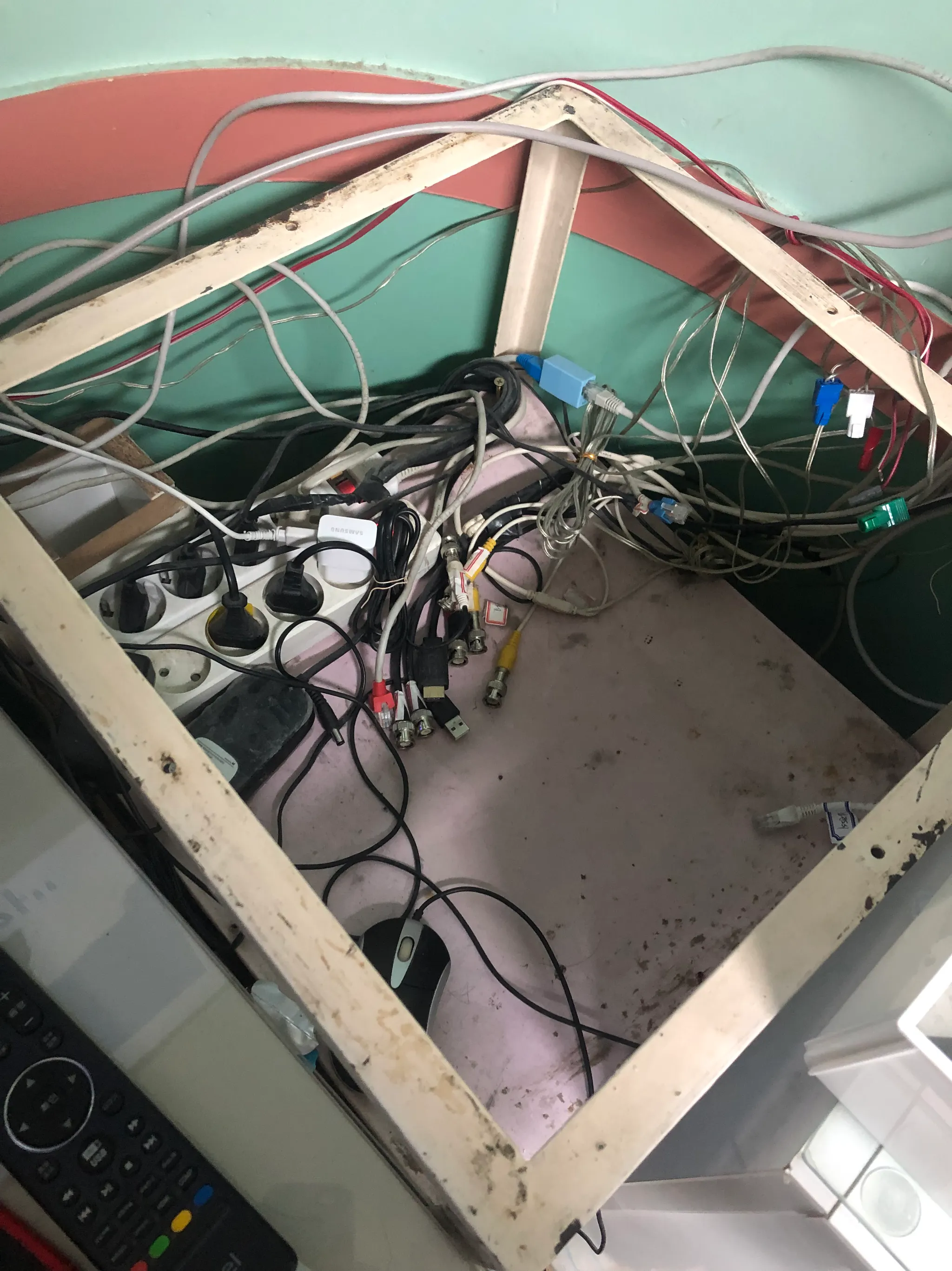 위에 뚜껑을 열면 안에 저렇게 어뎁터와 선들이 있다. 빈 공간에는 CCTV 녹화기가 들어간다. 저 아래로는 또 CCTV 어뎁터가 정신없게 놓여있다. 맨 위에 ‘뚜껑’ 아래로 ‘CCTV’ 받침대와 ‘어뎁터’ 받침대 까지 총 3층의 콘솔이 필요하다. 1층은 어뎁터 층. 2층은 지금 보이는 CCTV 녹화기 층. 3층은 제일 위에 오디오 플레이어 층이다. 아울러 모서리를 보면 모서리가 ‘라운드’로 둥글게 되어있다. 보다 공간을 활용하기 위해서는 콘솔의 ‘모서리’를 쳐내야 하는 것이다.