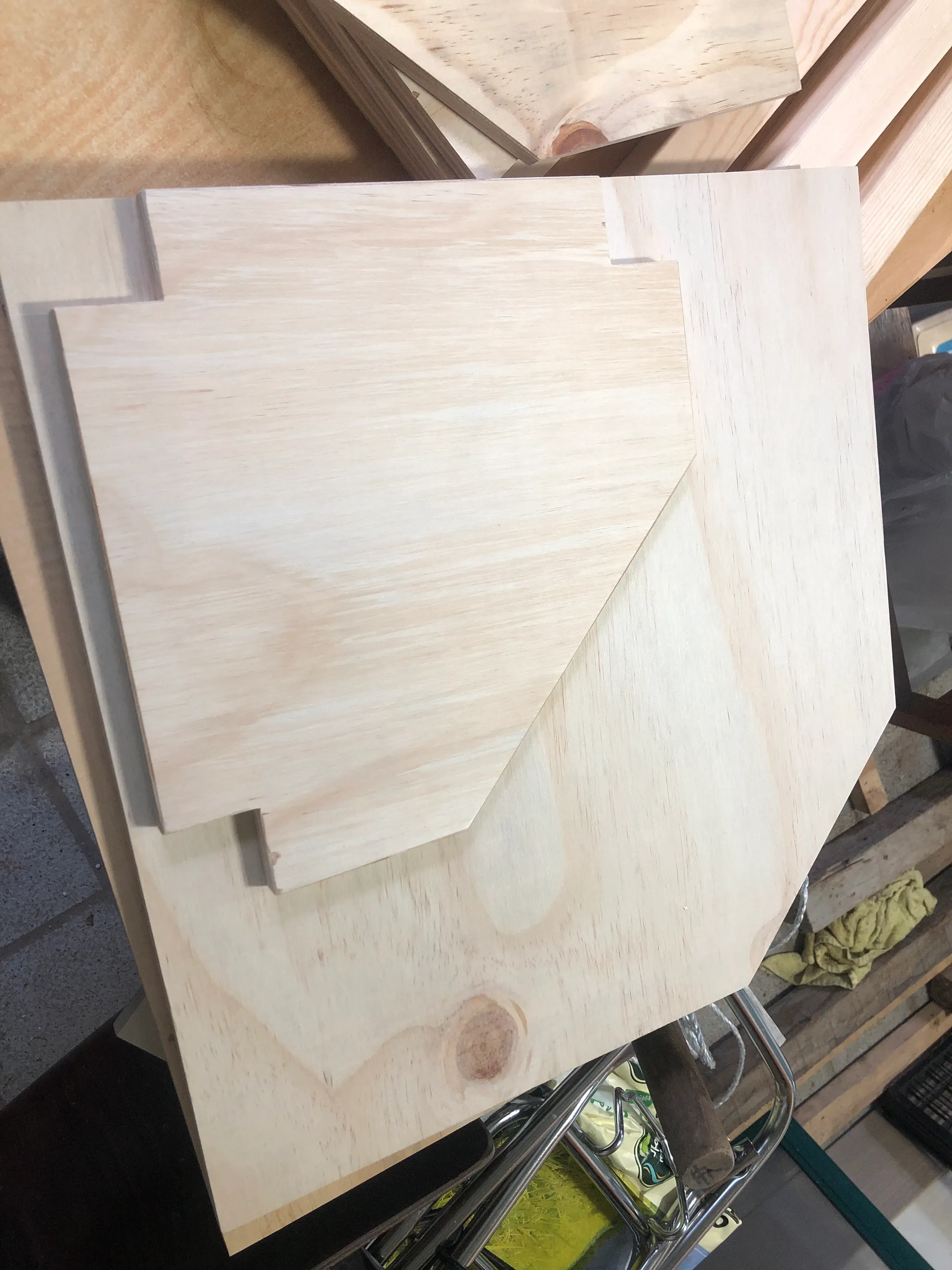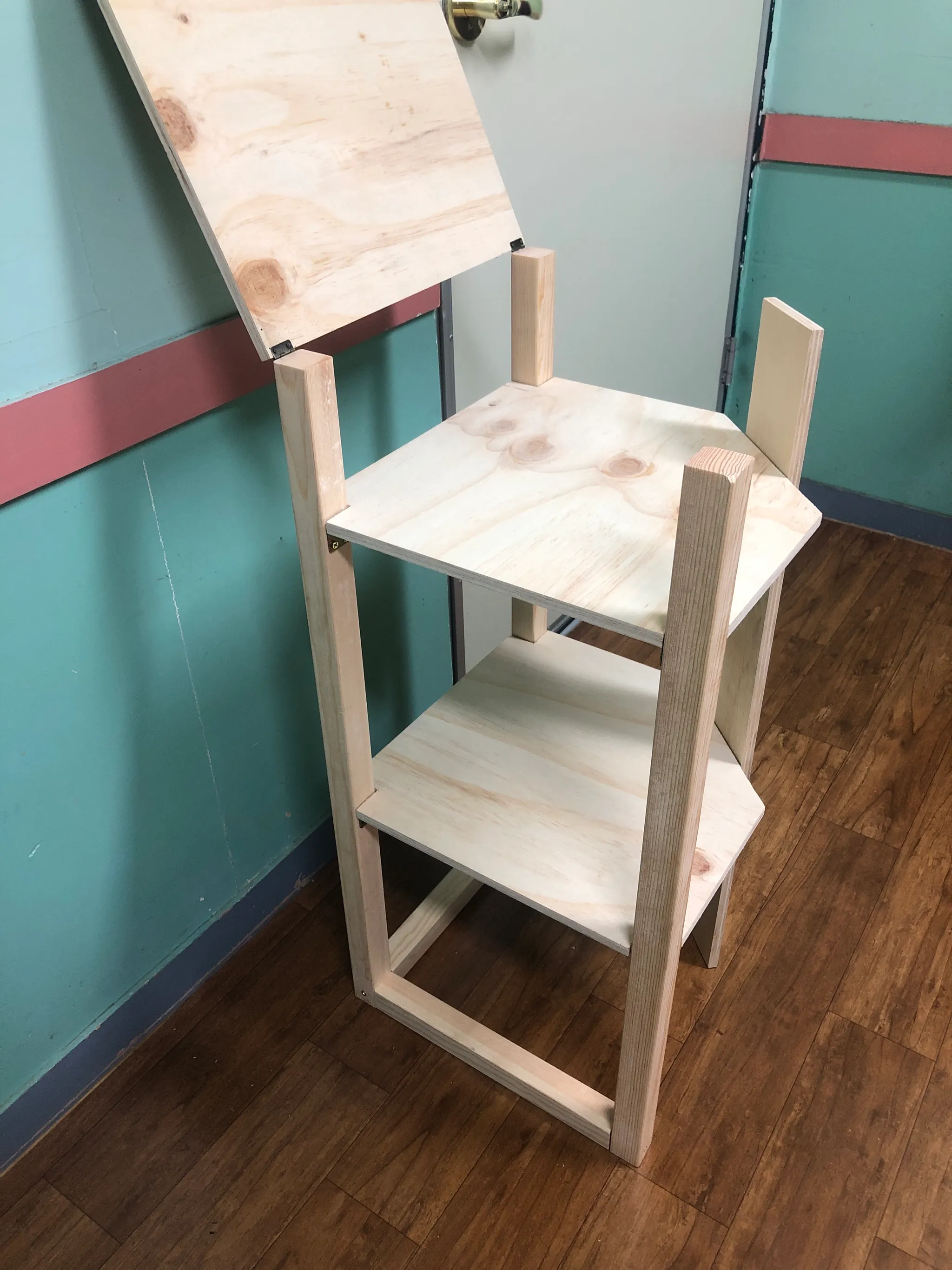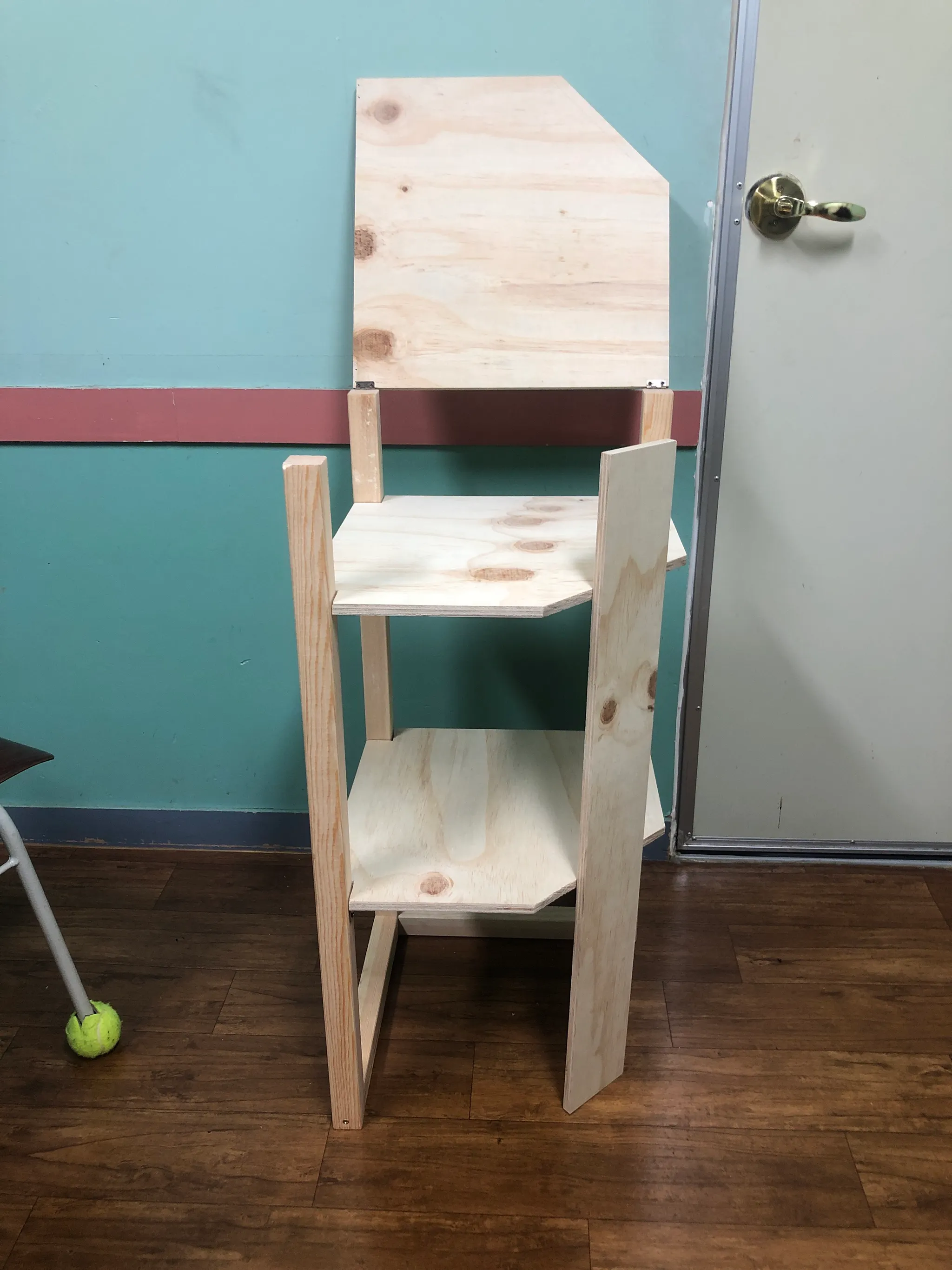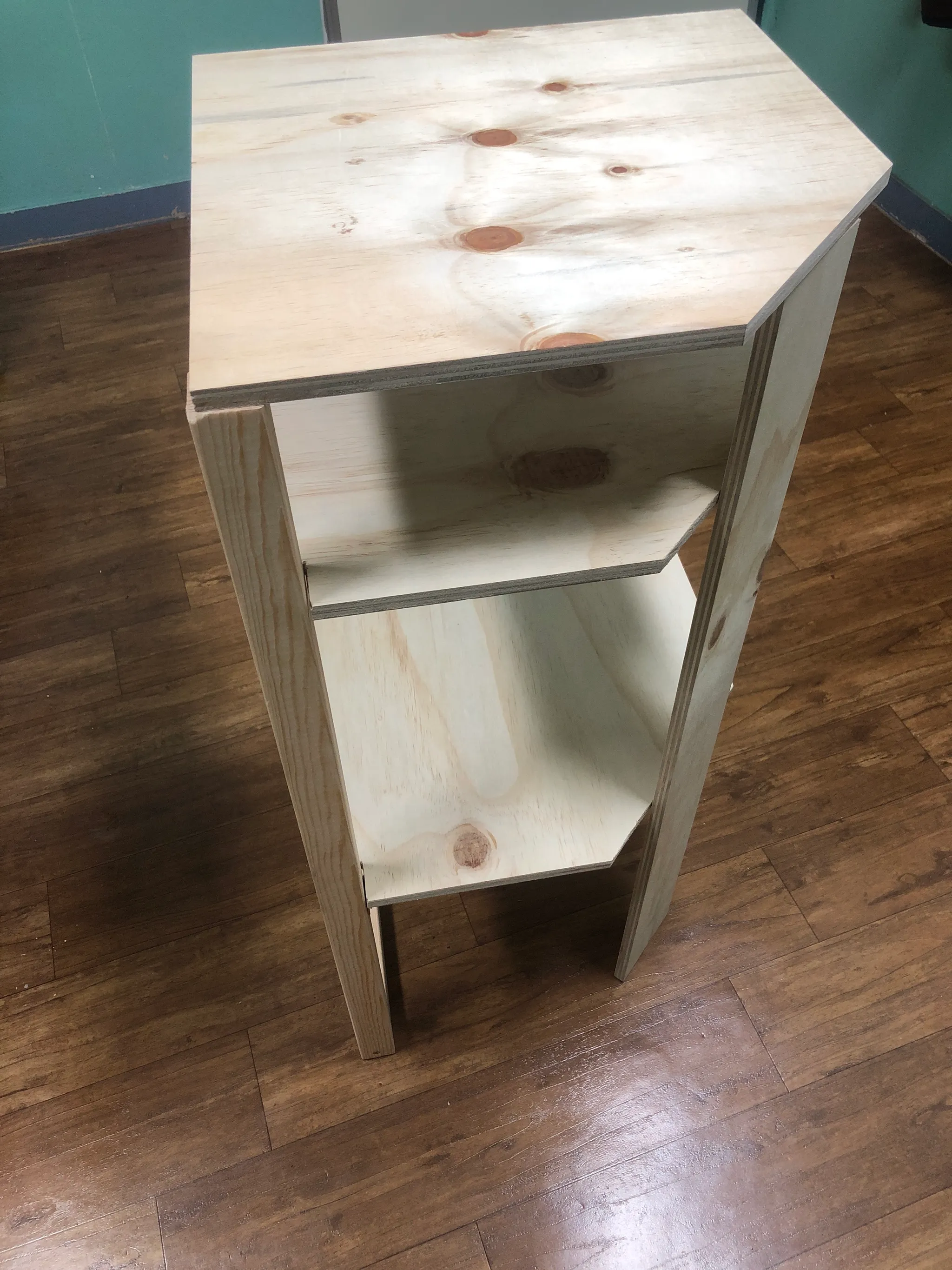 맨 위에 뚜껑은 자르지 말아야 하는데 처음 작업부터 실수로 그만 뚜껑의 모서리를 따고 말았다. 하아…. 다리가 3개는 ‘각진 나무’이고 나머지 하나는 사선으로 잘린 모서리에 걸친다. 그래서 다른 나무보다 뚜껑이 사선쪽이 더 길다. 이걸 잘라선 안되는 거였는데, 내가 그만 자르고 말았다.