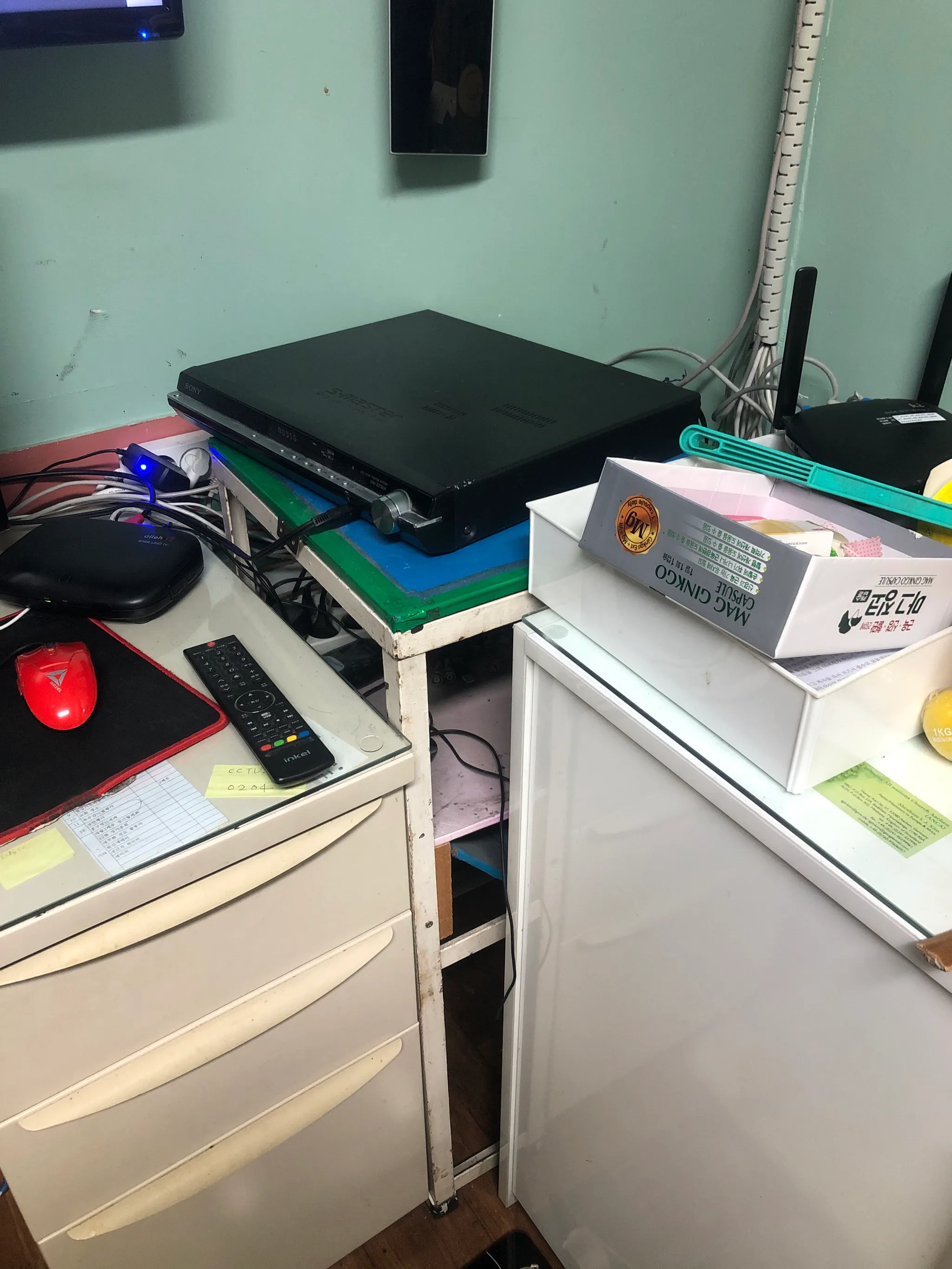 책상을 더 넣지 못하는 이유는 책상 반대편에 저 ‘철재 바침대’가 있어서이다. 이것을 나는 ‘콘솔’이라 부르겠다. 저 콘솔은 CCT녹화기와 오디오 플레이어를 받쳐두는 것이다.