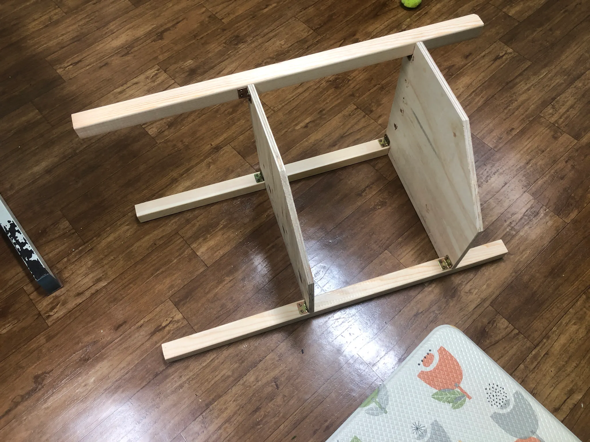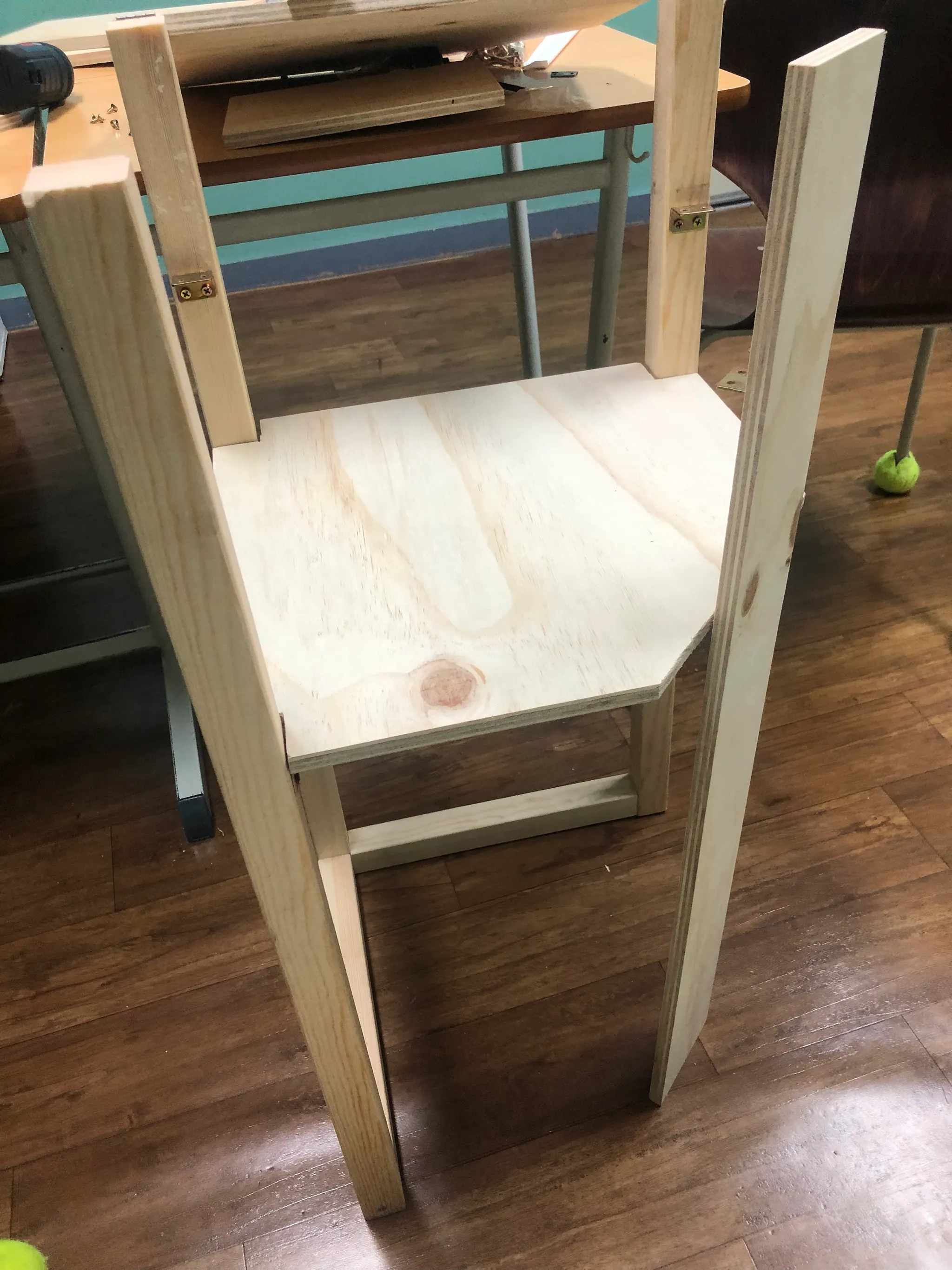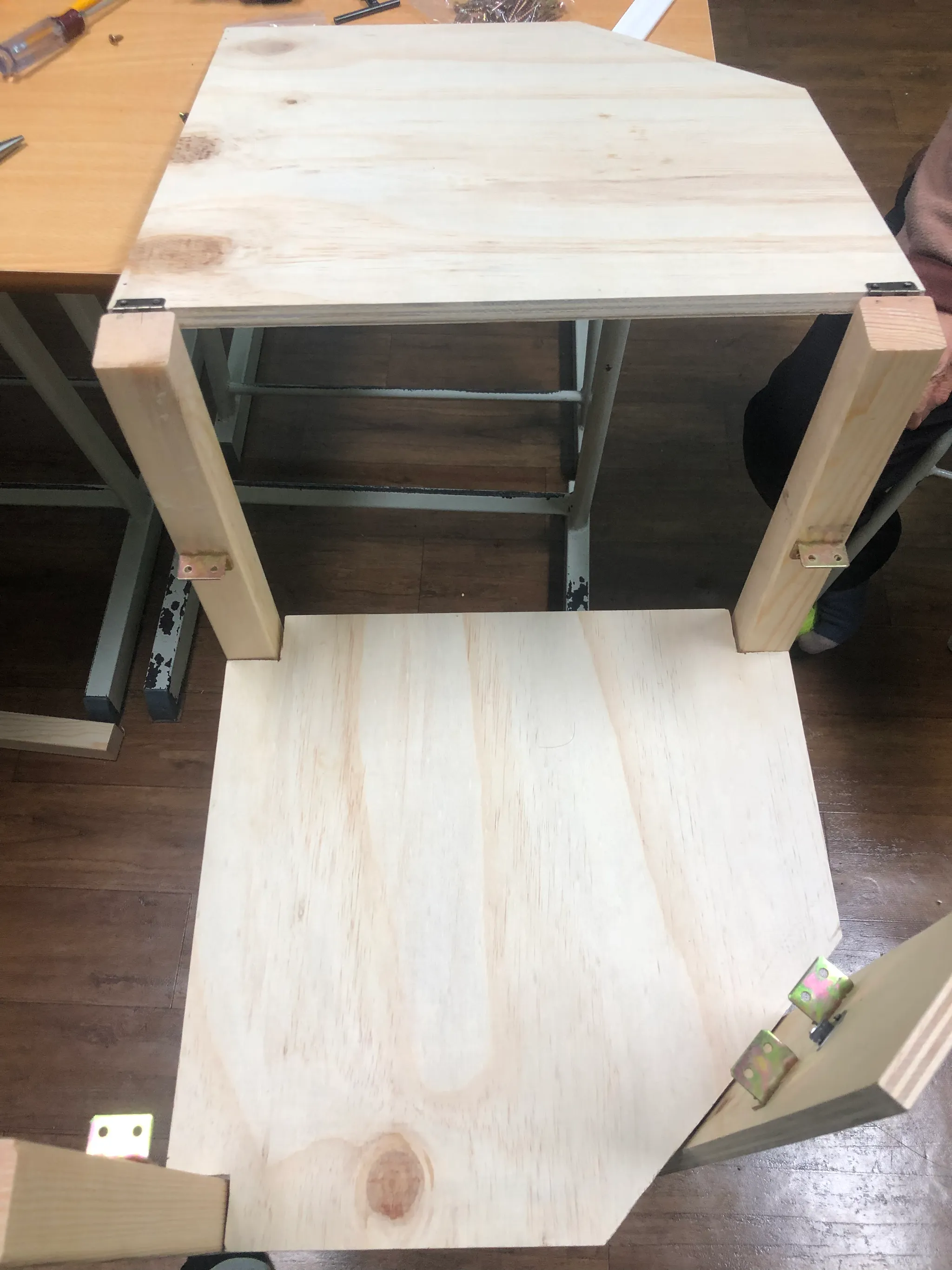 모서리 따는 작업을 마친 후, 기둥 세 개를 모서리 딴 곳에 물린 뒤 드릴로 고정을 하였다. 다리 하나가 덜 들어가서 아직은 많이 흔들린다.