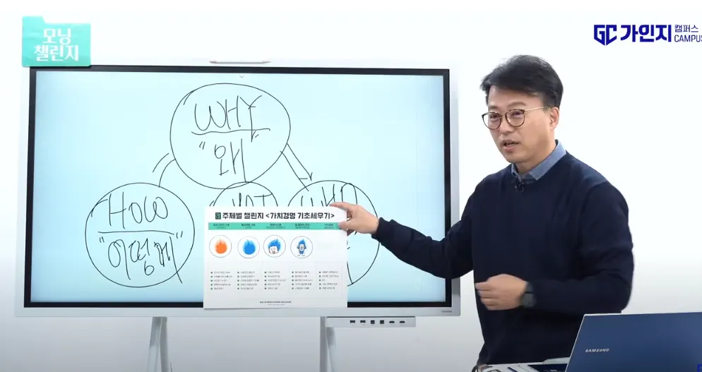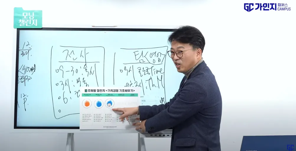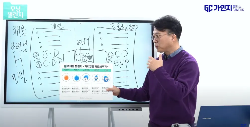 가인지를 통하여 일중리 동안 ‘가치 경영 기초 세우기’ 챌린지를 하였다. 매일 아침 7시 30분, 운동을 마치고 오자마자 밥상 앞에서 노트북으로 타이핑을 하며 한시간 동안 수업을 듣고 정리하는 시간을 가졌다.